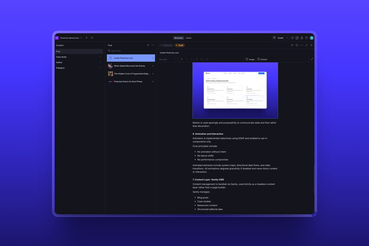 This article documents the technical decisions, architectural structure, and systems that power the Pixelvise website.
