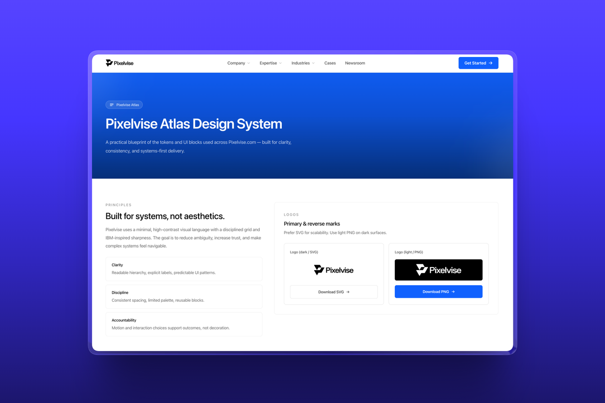 The interface is governed by the Pixelvise Atlas Design System, an internal system that defines visual, structural, and behavioral rules across the platform.