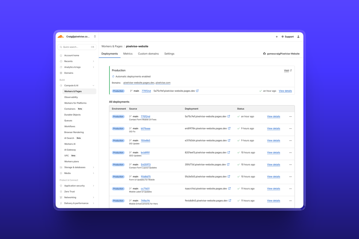 Pixelvise.com is deployed on Cloudflare Pages for global distribution, simplicity, and reliability.