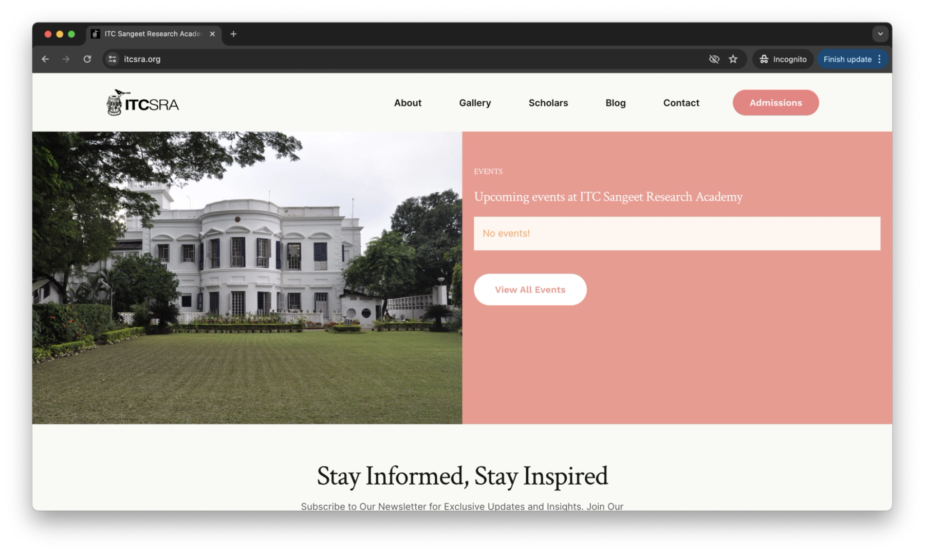 In 2024, our collaboration with the ITC Sangeet Research Academy (ITCSRA) presented an exciting opportunity to reimagine their digital presence. Tasked with revitalizing their outdated website, we set out to address a myriad of challenges that had accumulated over time. The original platform was burdened with bugs, bloated code, and a lack of modern CMS integration, making it difficult to navigate and maintain.